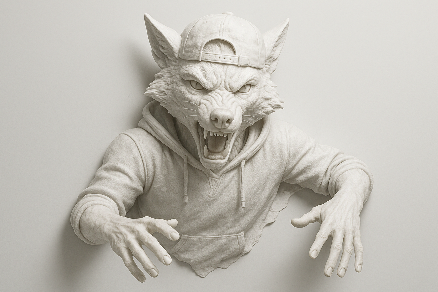 The modular structure mounts onto the wall with a minimal offset, creating an even halo effect behind the sculpture. The surface is sanded, primed and coated in a single matte tone, achieving a seamless plaster-like look — as if the character is emerging through the wall. The system is compatible with standard 12V LED setups and installs easily in a variety of interior environments.